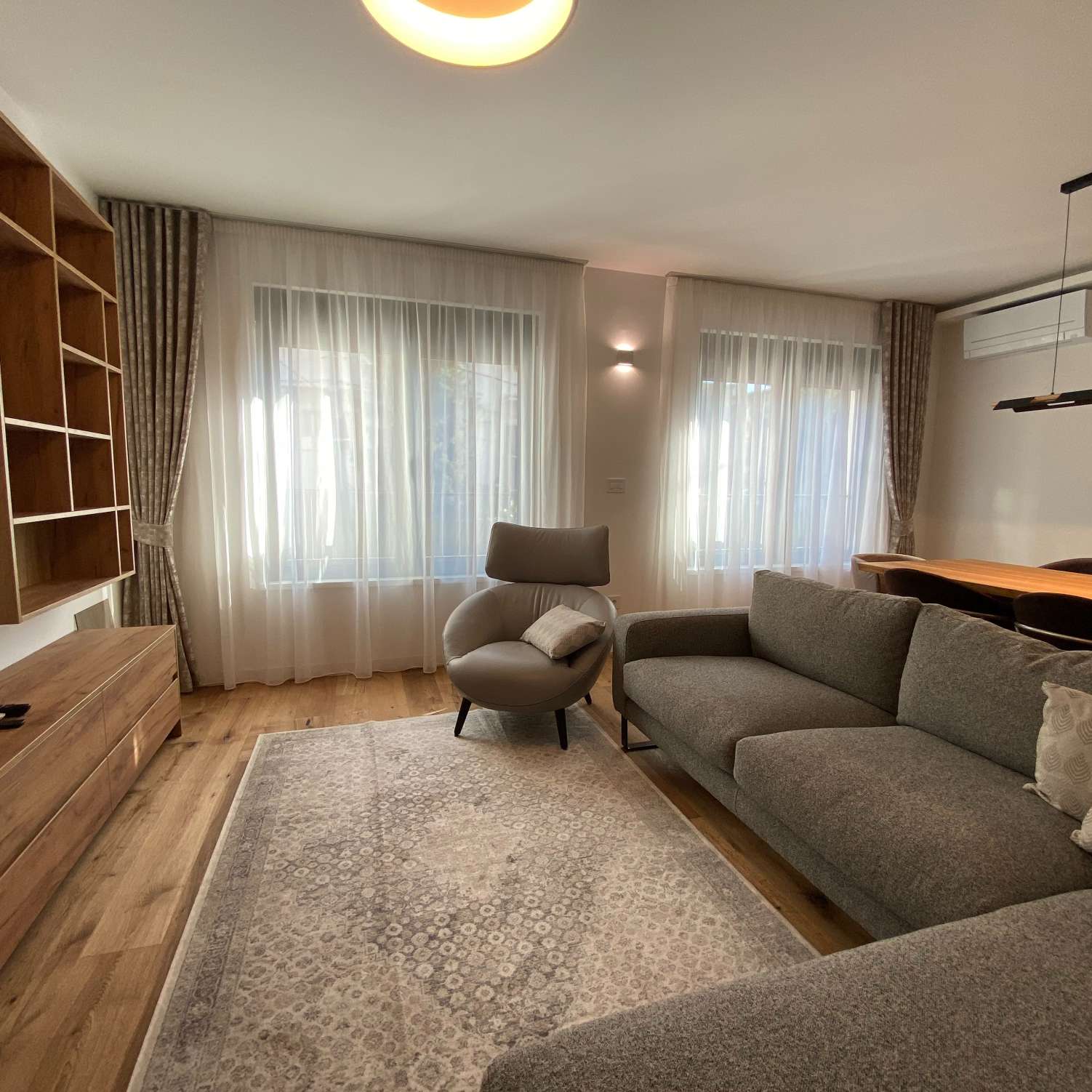 Pesak-bež zavese od laganih materijala omogućavaju ulazak prirodnog svetla, dok istovremeno stvaraju topao i gostoljubiv prostor.